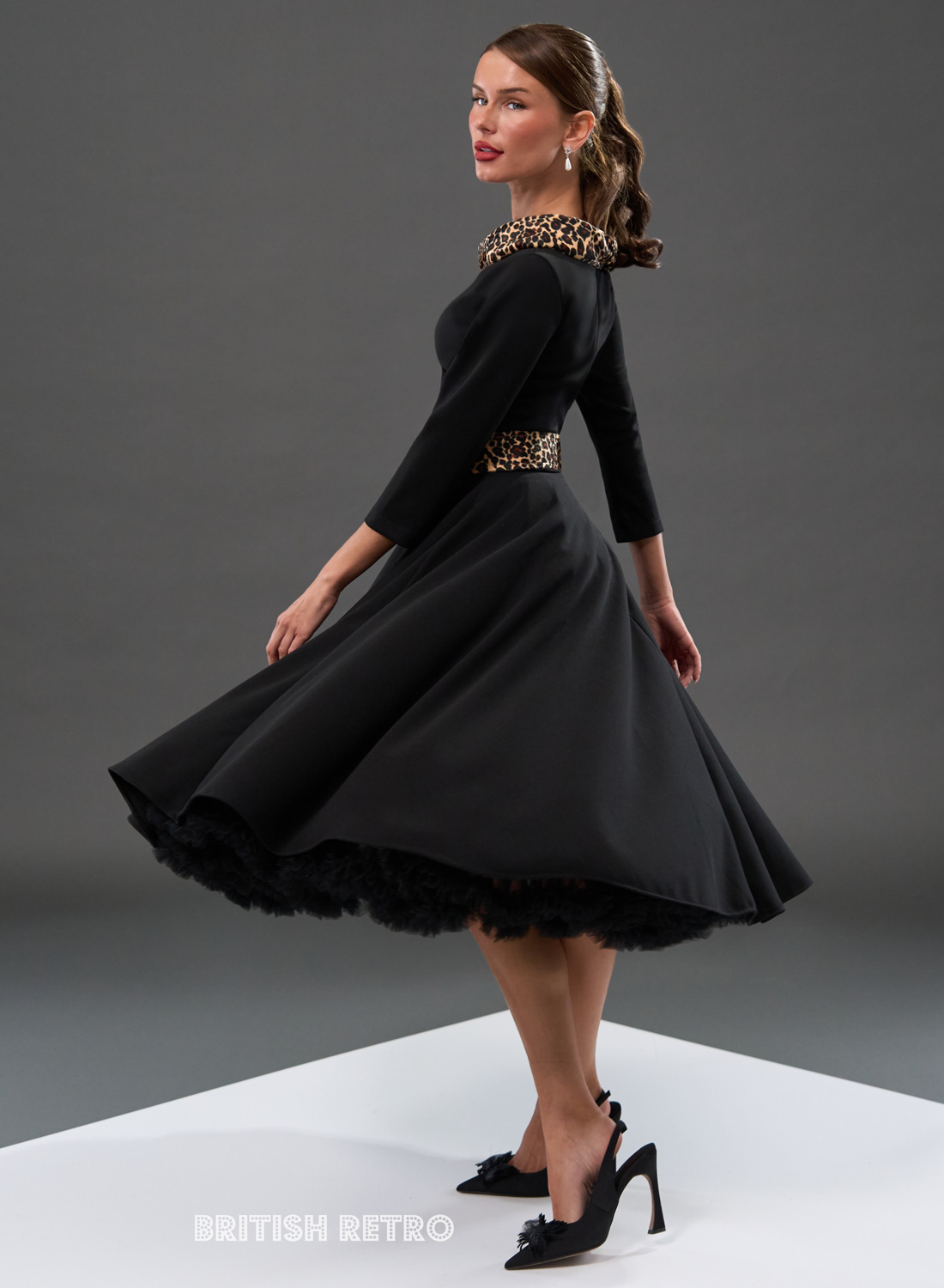 Montclair Black Leopard Faux Fur Collar 50s Swing Dress