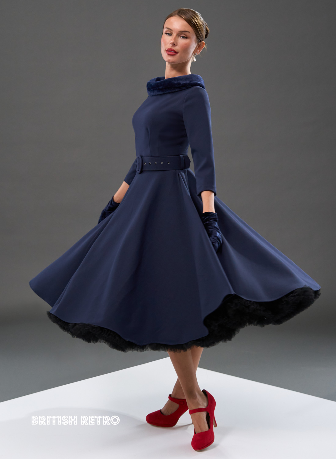 Montclair Navy Faux Fur Collar 50s Swing Dress