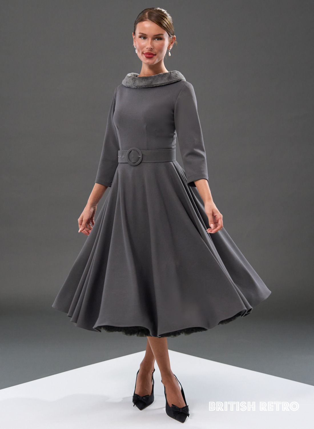 Montclair Smoke Faux Fur Collar 50s Swing Dress