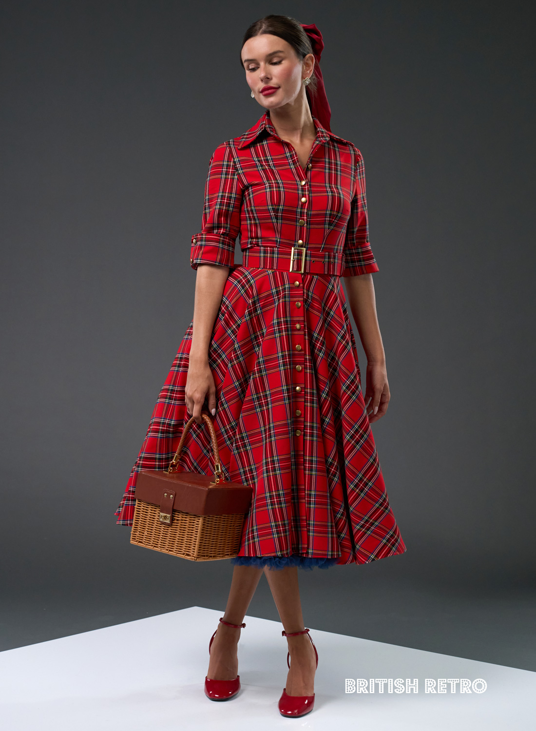 A dress that’s blessed with effortless elegance and glamour, our ‘Way Out West’ Royal Stewart tartan swing dress, inspired by the style of the great Katharine Hepburn. This chic full circle dress, fastens all the way down with vintage look brass coloured buttons and also comes with a matching vintage metal buckled belt. She is made from a traditional woven Royal Stewart tartan and features half sleeves with nifty buttoned cuffs and an elegant 50s, semi flared collar. To create a full-on 50s look just pop one of our fluffy black petticoats underneath. The petticoat is sold separately.
